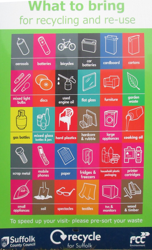 | For plastic bags and similar, use the bins at Tesco's or Waitrose in Saxmundham, or at most branches of the Co-op locally. | |||||||