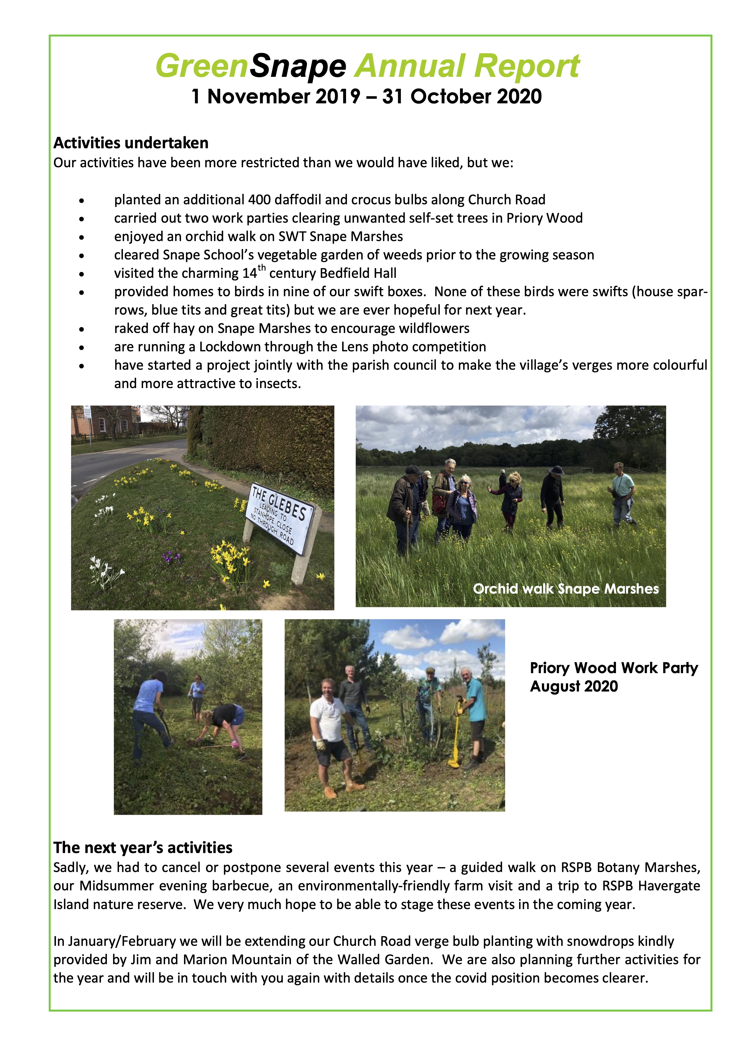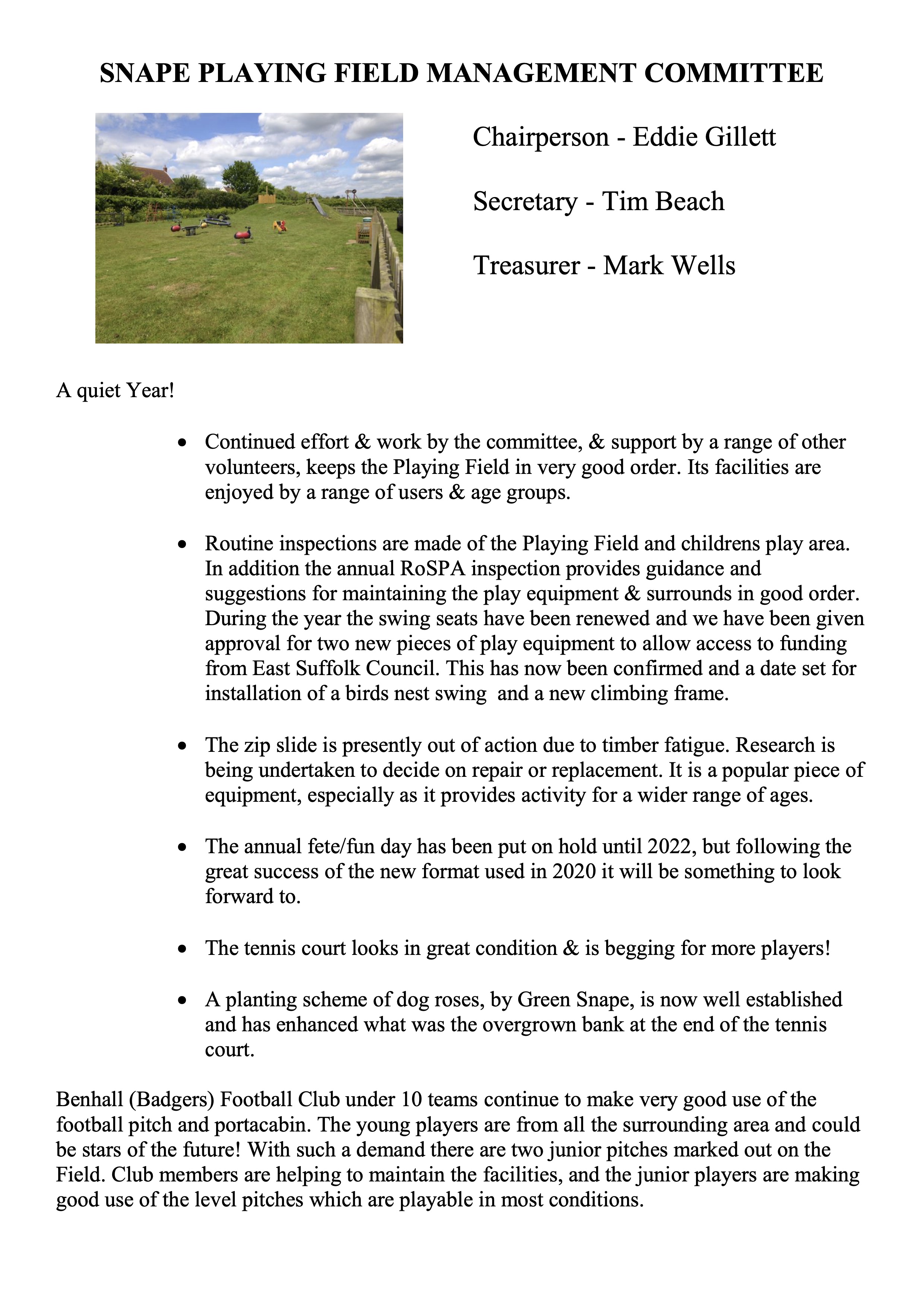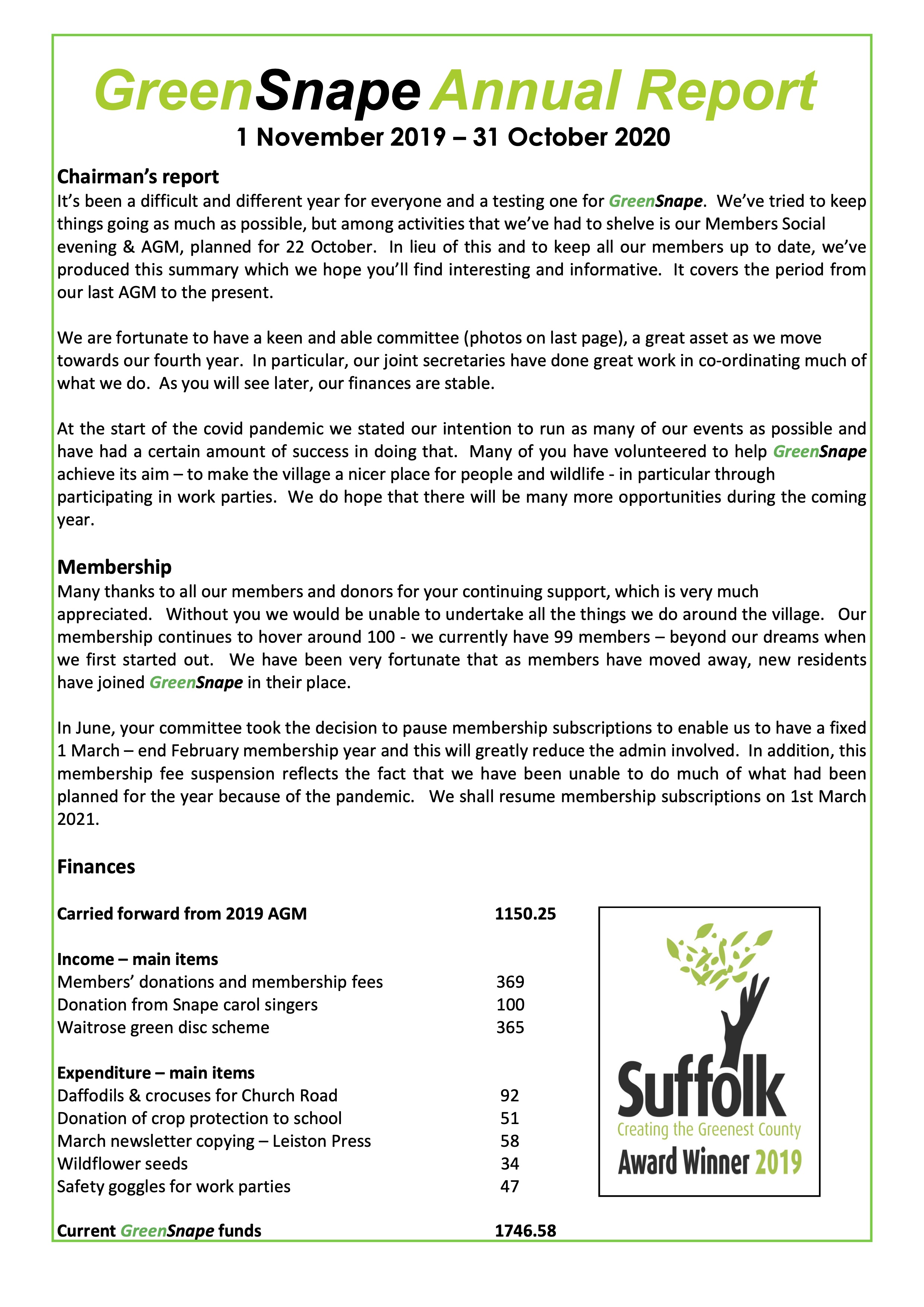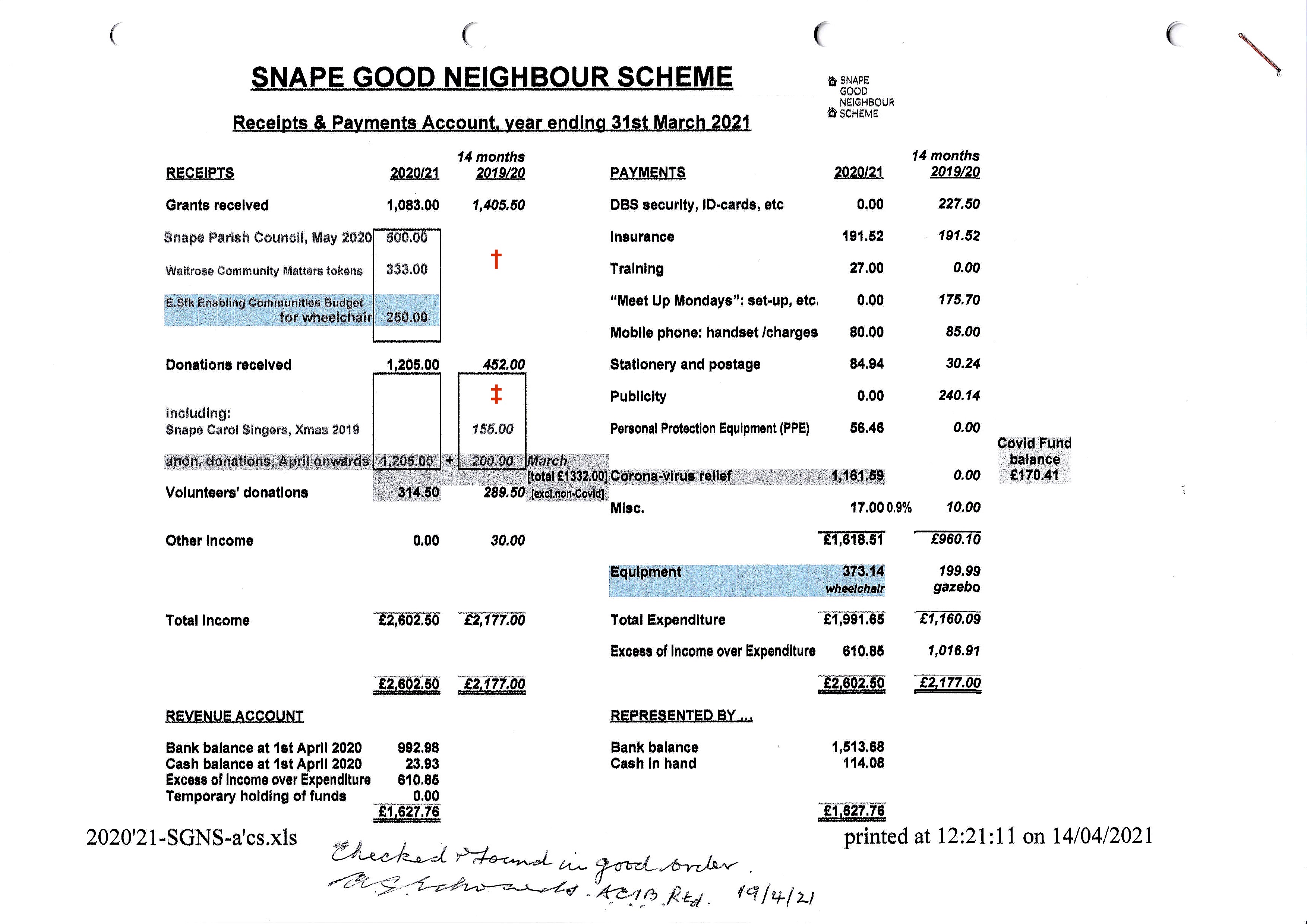 2019/20Grants received: Snape PC £500; Waitrose Community Matters £345; County Councillor's Locality Grant £560.50 = £1405.50