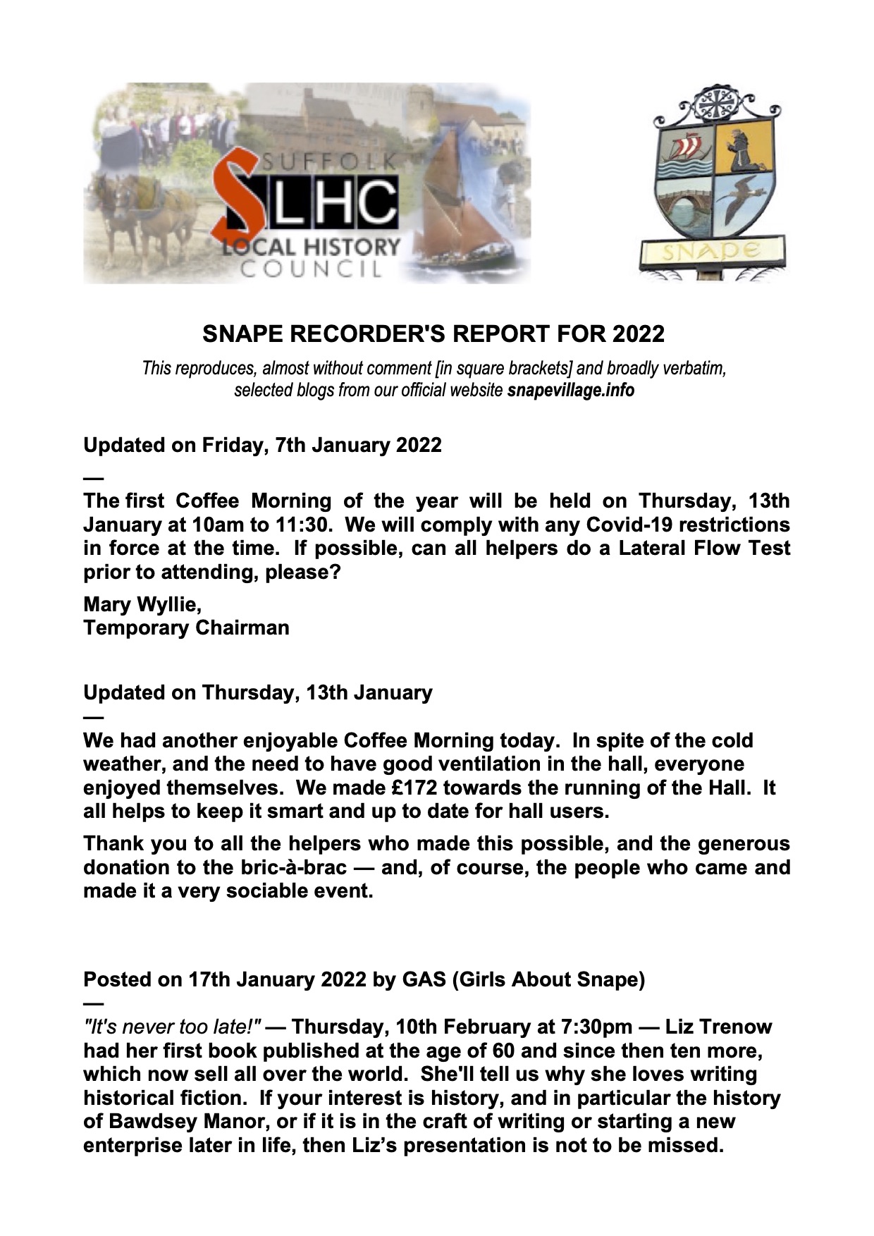 Village reports are produced annually in villages across Suffolk, submitted to the Suffolk Local History Council who, after collation, forward them on to Suffolk Archive (formerly Suffolk Record Office) for future generations to understand our way of life. |