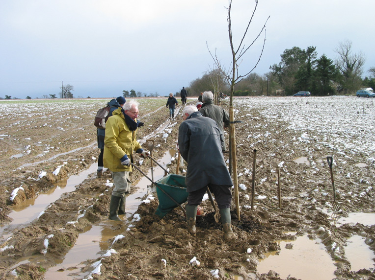 John surveyed the Woodland site shortly after the lease was agreed with the landowner, and was actively involved in tree planting [during the Woodland Group's early days, around 2003-05]. John is dressed in the yellow coat in the muddy scene below.